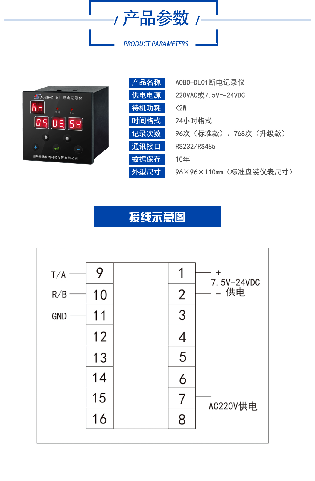 AOBO-DL01断电记录仪以MC51单片机为核心,实时检测电源,电源滑落时(断电)单片机记录断电时间,恢复供电时单片机将断电时间与上电时间一同存入存储器,并对断电时长进行累积。